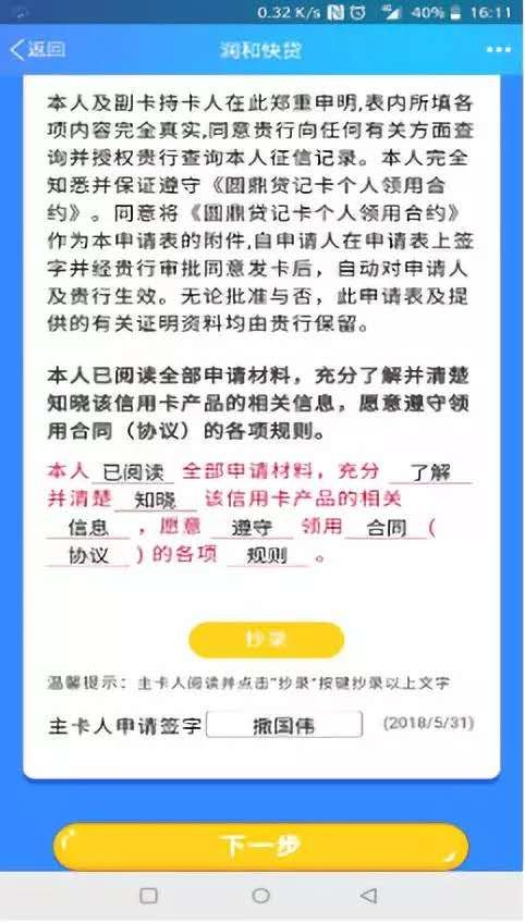 錄完信息后點擊下一步,系統判斷是否具備信用卡申請資格