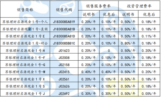 管理人自 2023年10月9日起,對“蘇銀理財啟源融匯現金1號”理財產品的銷售服務費、投資管理費給予優惠,具體安排如下: