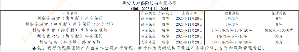 代銷利安人壽保險股份有限公司產品披露